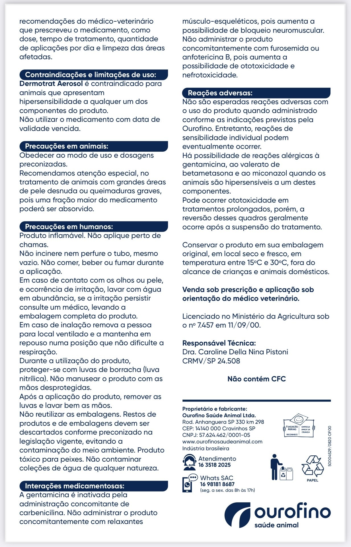 Uso em gatos: Piodermites Superficiais e Profundas Recorrentes: Staphylococcus spp, Proteus spp, Pseudomonas spp, Corynebacterium spp, Escherichia coli. Dermotrat Aerosol é indicado para tratamento auxiliar das lesões cutâneas de várias etiologias, como: Micobacterioses Atípicas, Dermatite Irritante de Contato, DAPE (Dermatite Alérgica a Picada de Ectoparasitos), Hipersensibilidade Alimentar, Dermatoses Imunomediadas, Picadas de Insetos, Queimaduras, Úlceras de Decúbito, Proteção das feridas cirúrgicas. Dermatofitose: Microsporum canis, Microsporum gypseum, Trichophyton mentagrophytes.