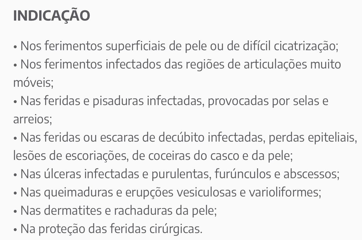 É indicada no uso de ferimentos superficiais de pele ou de difícil cicatrização; ferimentos infectados das regiões de articulações muito móveis; feridas ou escaras de decúbito infectadas, perdas epiteliais, lesões de escoriações, coceiras da pele; úlceras infectadas e purulentas, furúnculos e abscessos; queimaduras e erupções vesiculosas e varioliformes; dermatites e rachaduras da pele; proteção das feridas cirúrgicas.